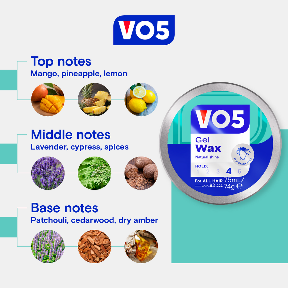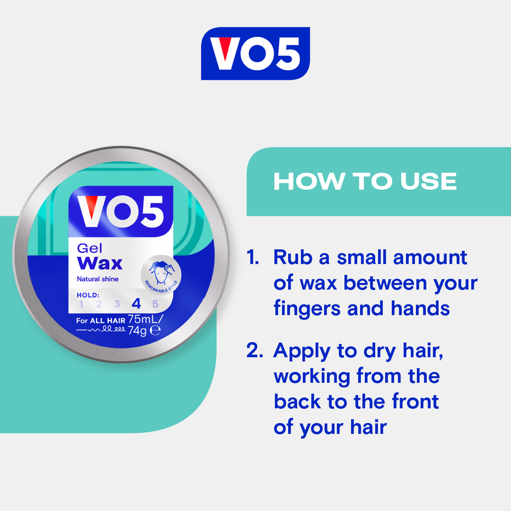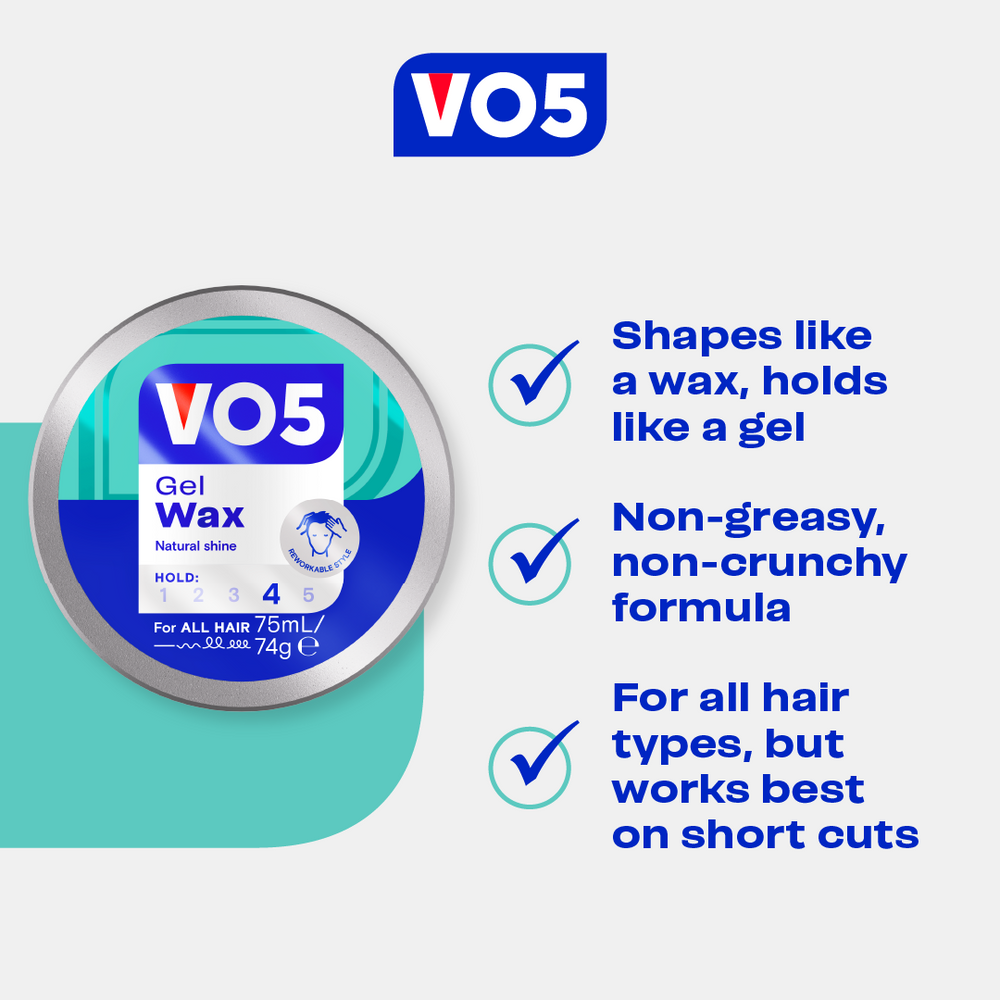 VO5 Gel Wax shapes like a wax but holds like a gel giving your hair a reworkable texture with a natural shine. Easy to work in and wash out with its non-greasy formula, your hair will be left with a natural shine without the sticky residue or greasiness, ready to rework your styles from day to night! Work a small amount of gel from the back to the front of your hair for a long-lasting natural hold and shine.